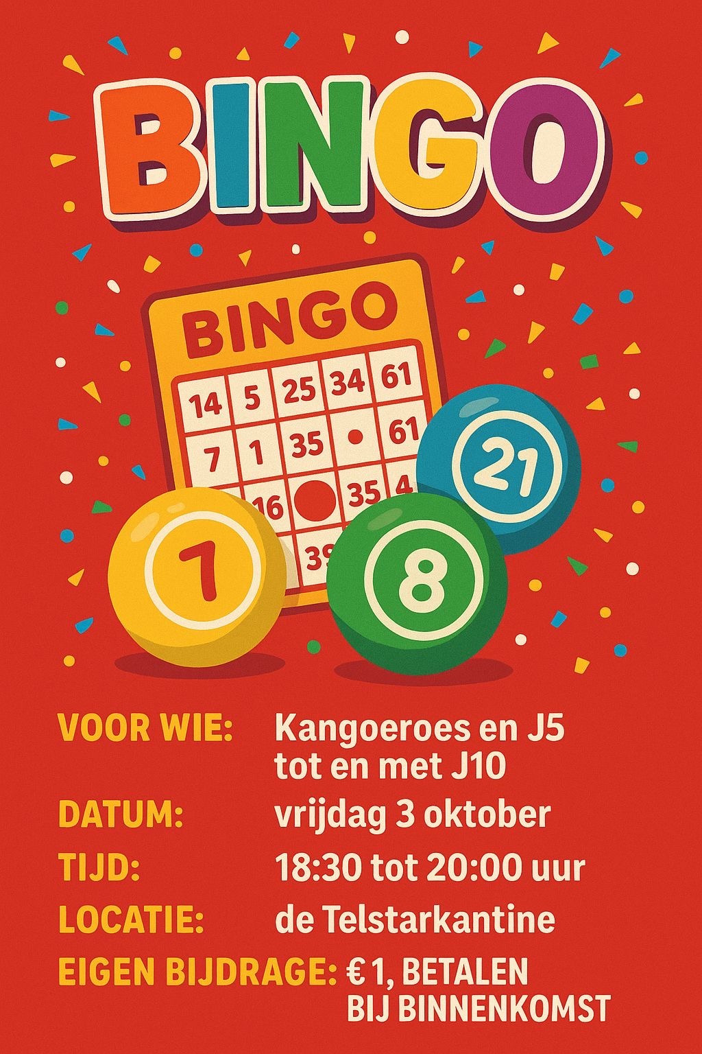 Vrijdag 3 oktober van 18:30-20:00u zijn de Kangoeroes en de J10 t/m de J5 uitgenodigd voor de jeugdbingo in de Telstarkantine.