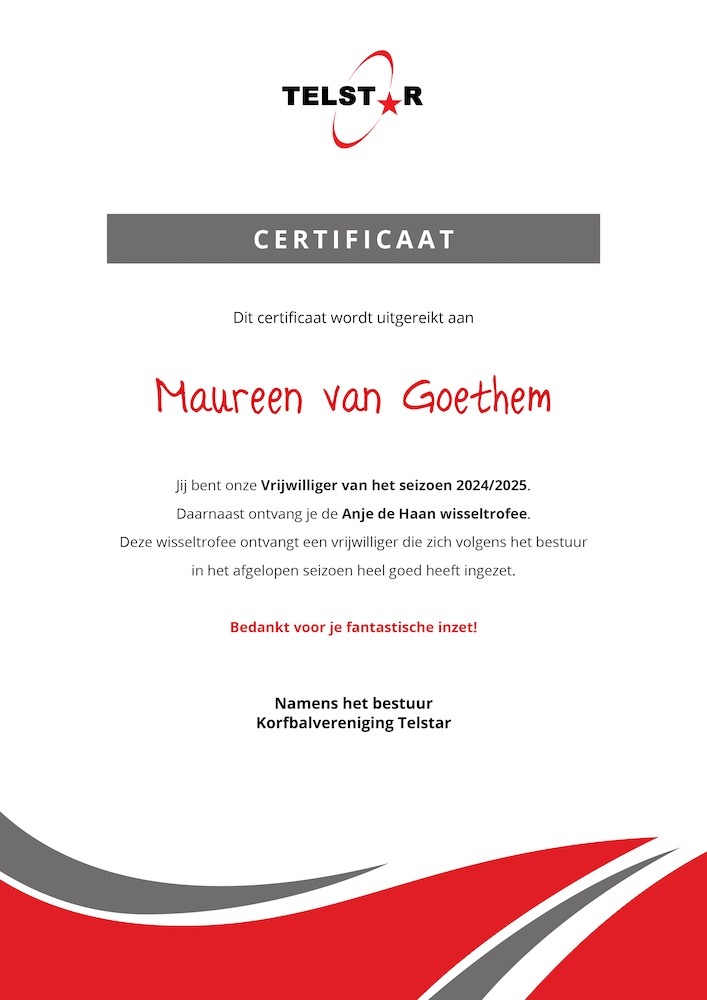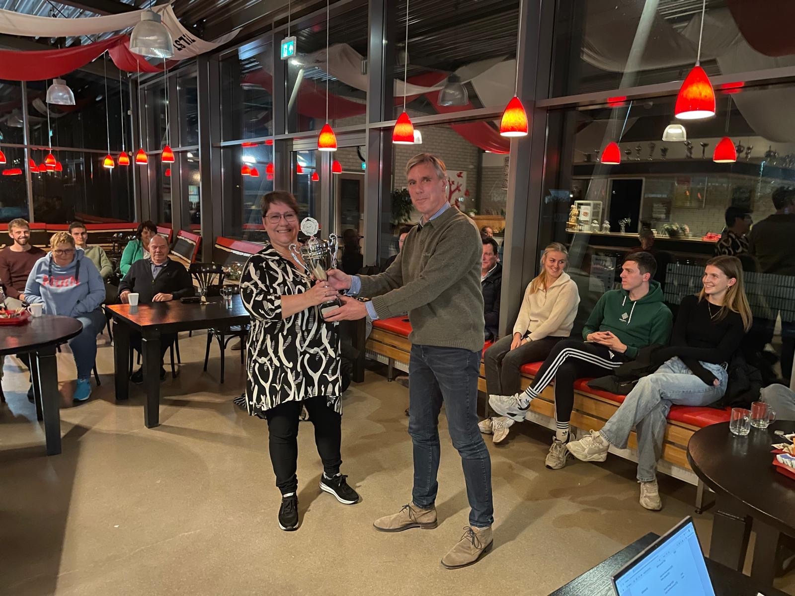 Nadat iedereen haar met een applaus waardeerde, overhandigde de voorzitter, Rob Harmsen, het bijbehorende certificaat. “De trofee met bijbehorend certificaat zijn een belangrijk gebaar om te laten zien dat wij de inzet van vrijwilligers waarderen”, aldus Rob. “En deze keer is het een warm gebaar en een welverdiende erkenning voor Maureen.”