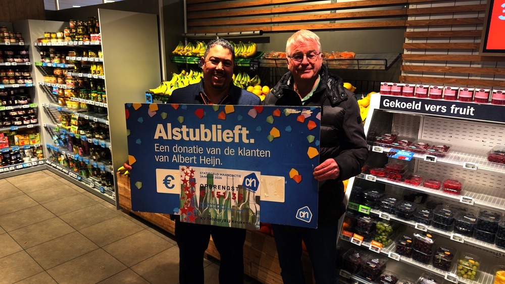 Dinsdagmiddag 17 februari werd de cheque door Mohamed (supermarktmanager) en Marinus (groenteman) overhandigd aan Wout.